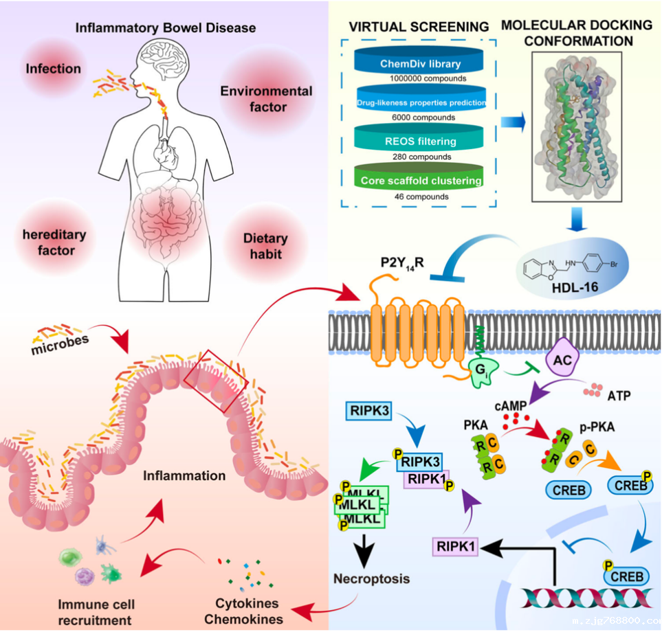 本项研究揭示了P2Y14R在UC发病过程中的关键作用。研究团队基于UC患者和实验性结肠炎小鼠肠道组织中P2Y14R特异性高表达,发现肠上皮细胞P2Y14R敲除可以显著改善DSS造模引起的小鼠体重减轻、稀便和肠道出血。进一步的研究发现,P2Y14R的缺失并不影响肠上皮细胞的凋亡和焦亡,但显著改善了肠上皮细胞的程序性坏死。接着通过肠道类器官、转录因子预测及ChIP-qPCR等方法,揭示了P2Y14R依赖PKA/CREB通路促进RIPK1的转录,介导肠上皮细胞的程序性坏死,从而调控UC病程的分子机制。最后,利用自主设计合成的P2Y14R小分子抑制剂HDL-16,结合分子生物学和化学生物学手段,明确了HDL-16可通过靶向肠上皮细胞的P2Y14R发挥抗UC的作用,进一步明确了P2Y14R作为炎症性肠病治疗靶标的可行性。
