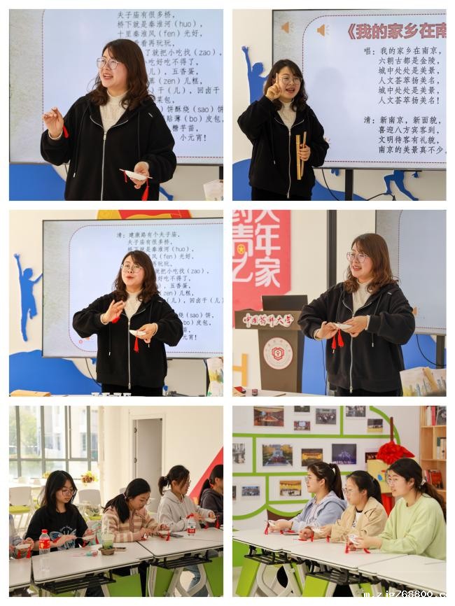 活动过程中,同学们在张老师的指导下,尝试学习南京白局的表演技巧。张老师带领同学们一起学说地道南京话,学唱南京白局“我的家乡在南京”选段,学习白局小乐器的使用,最后一起合奏演绎了一段生动的南京故事。同学们纷纷被南京话有意思的发音和南京白局接地气的表达所吸引,他们表示以后会更加深入地了解了南京地区的传统文化,也更加珍惜宝贵的非物质文化遗产。