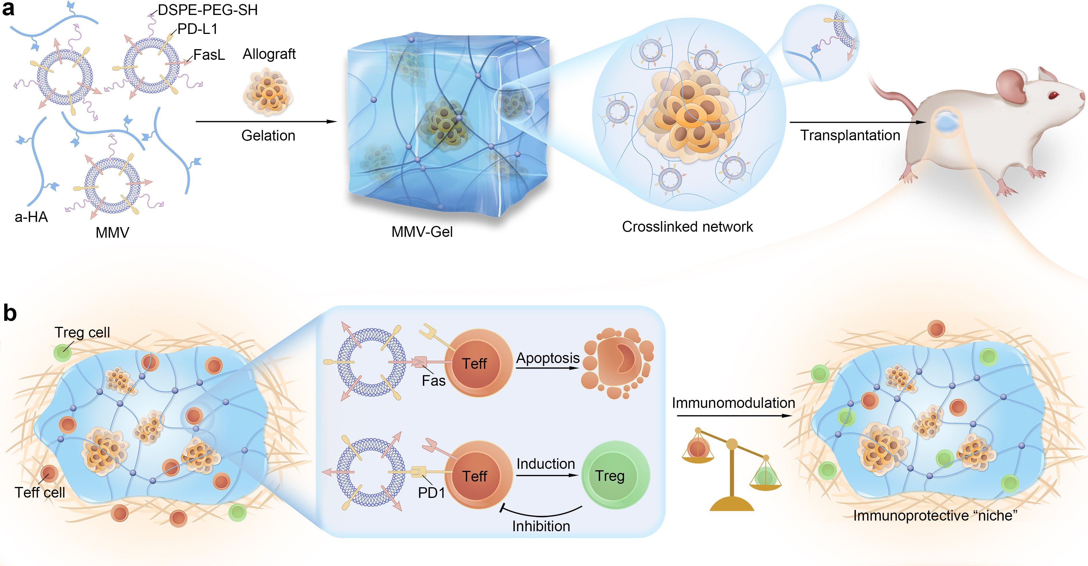 鉴于此,莫然教授课题组构建了间充质干细胞膜衍生囊泡(MMV)交联水凝胶(MMV-Gel)作为异体移植物的局部免疫保护“龛”,增强移植物的存活和功能。工程化的MMV表面上调Fas配体(FasL)、程序性死亡配体1(PD-L1)等的表达,并通过交联锚定于水凝胶中,与效应T(Teff)细胞上的Fas与PD1的结合,诱导Teff细胞的凋亡及调节性T(Treg)细胞的产生,形成局部免疫抑制性微环境来保护异体移植物。在异体胰岛及皮肤移植的小鼠模型上,MMV-Gel延长了移植物的存活,并长期维持其功能。该研究为抗异体移植排斥器件的开发拓展了新的思路和方法。